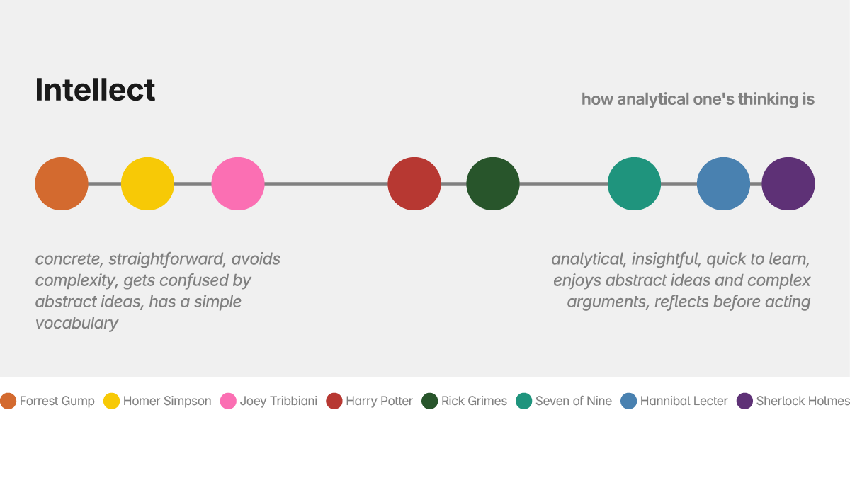 Understanding where your cast sits on this line is vital for engineering dialogue. A conversation between a high-Intellect character and a low-Intellect character is a goldmine for “talking past each other”: one is speaking in abstractions and metaphors while the other is speaking in concrete facts.