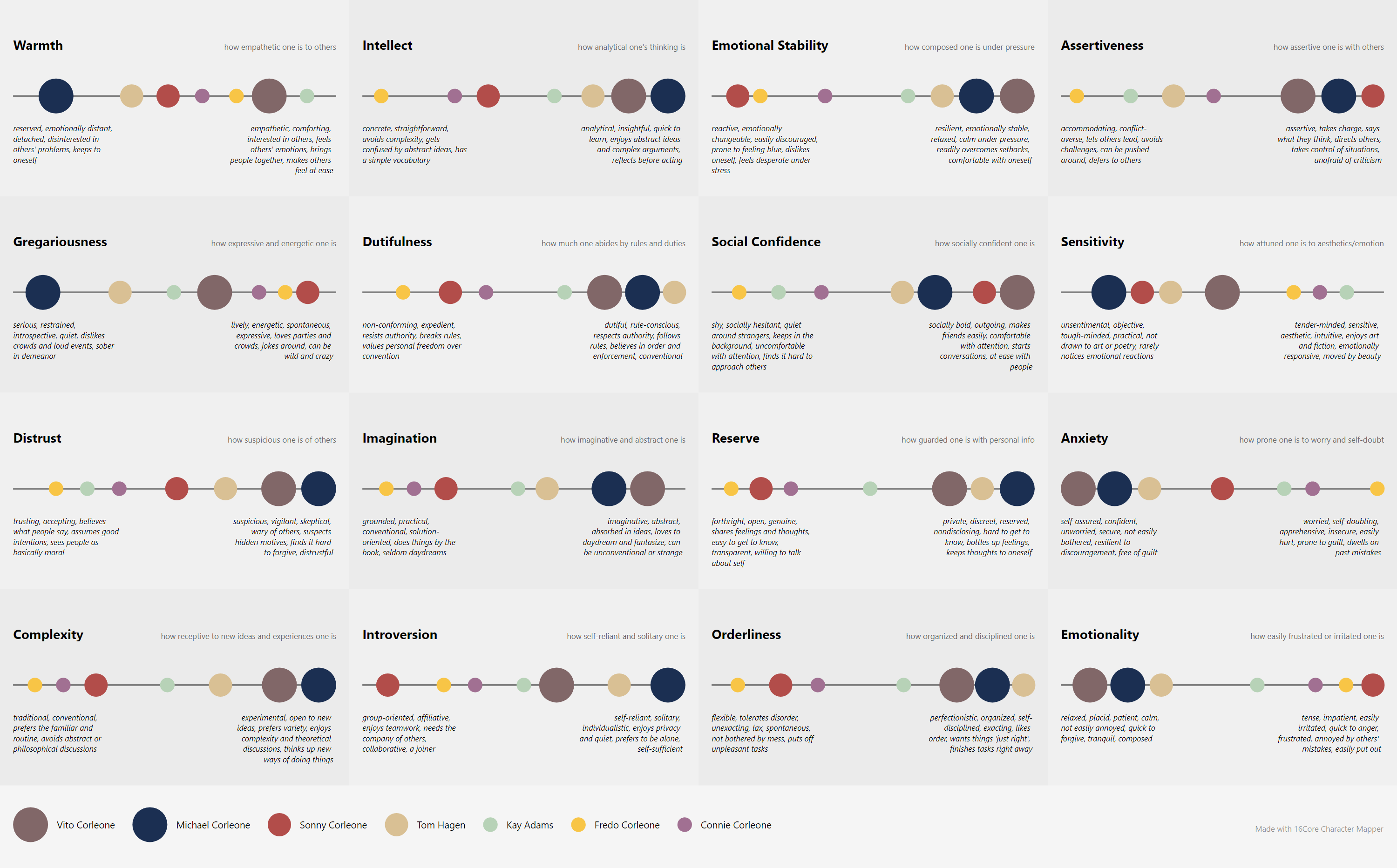 The personality-driven conflict of the Corleone family, mapped and analyzed with 16Core Character Mapper.